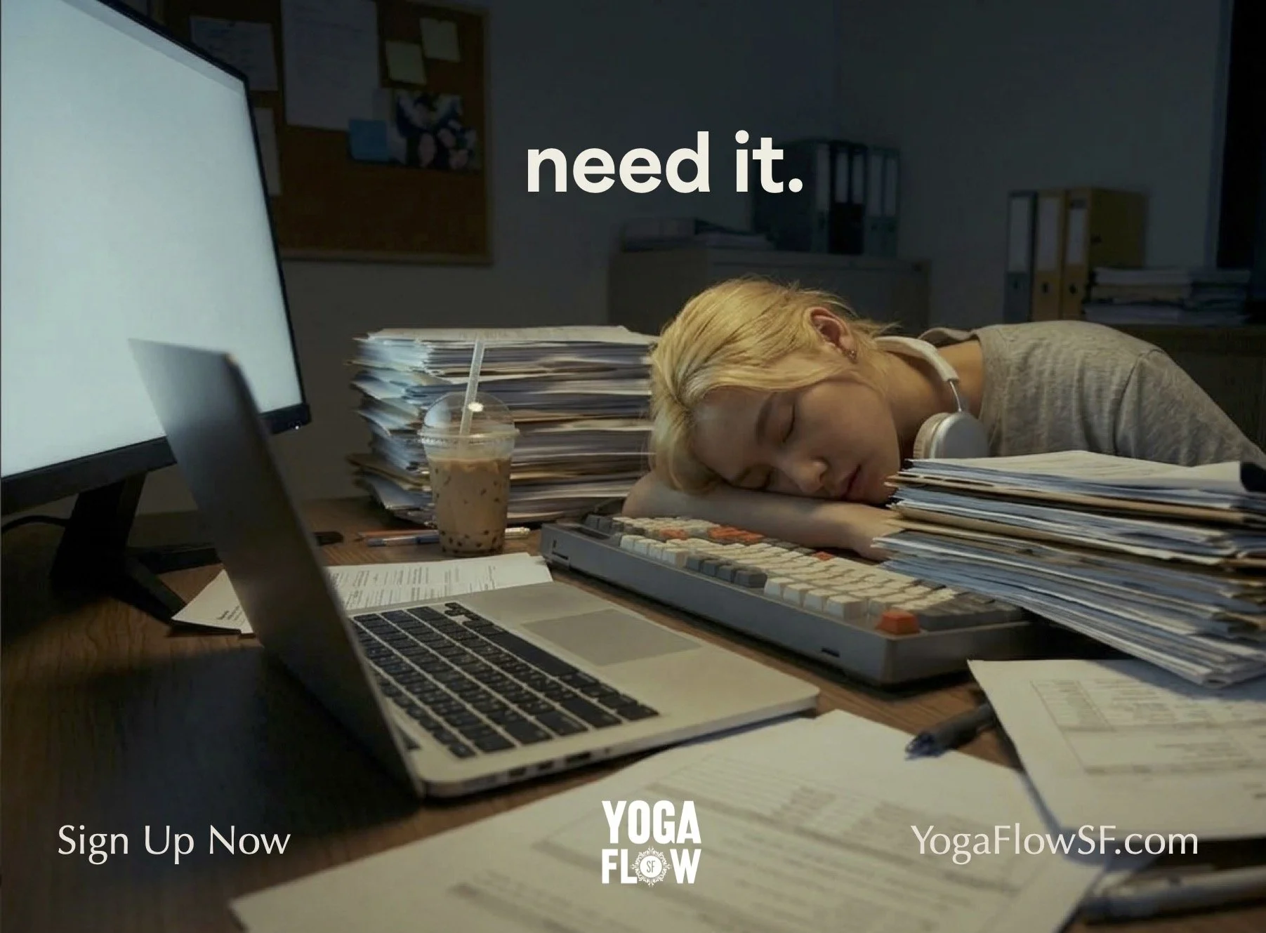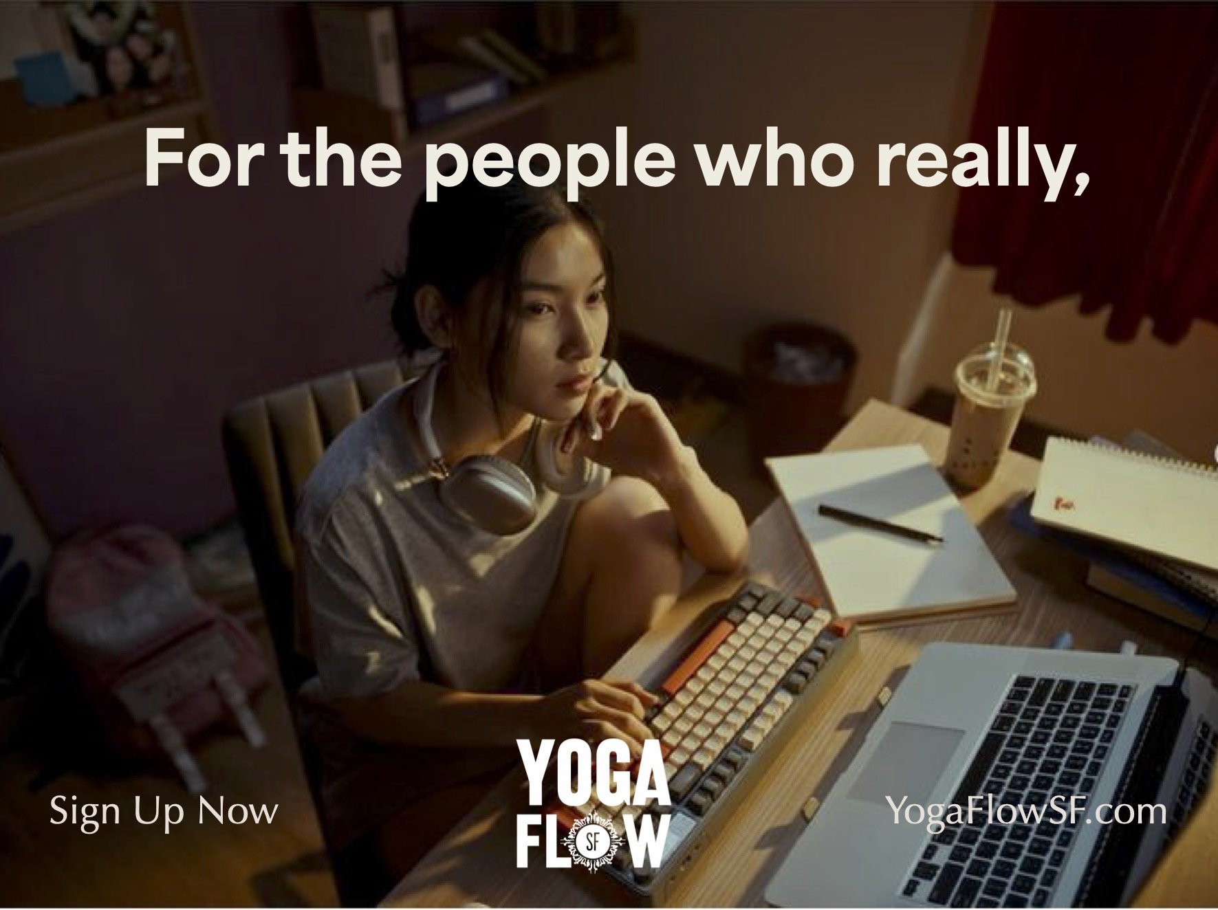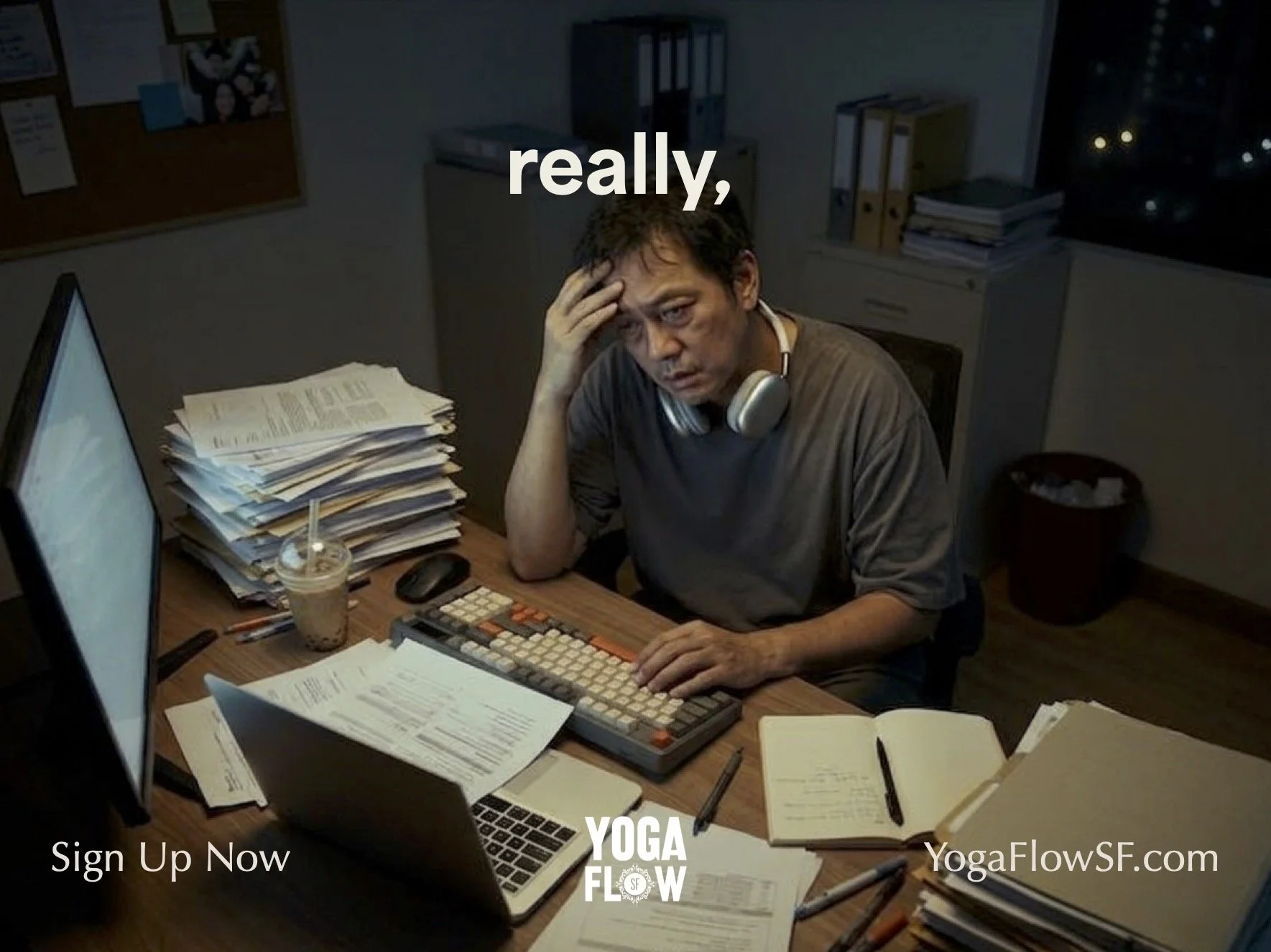 Yoga Flow SF is a small, intimate studio built for the people who need it most. This campaign targets burned-out SF professionals by meeting them exactly where they are: late nights, cluttered desks, and high screen times. The headline splits across three consecutive street-level ads, turning an OOH series into a single sentence you walk past. No yoga poses, no hard sell. Just an honest mirror held up to the audience, with a quiet brand voice that says: we see you.